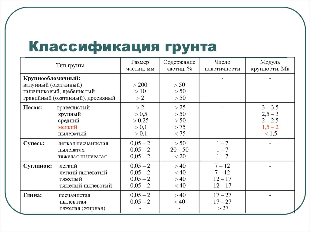 По размеру зерна частицы почвы делятся на три группы: глина, ил и песок. Глина имеет диаметр менее 0,002 мм (0,0008 дюйма), ил — от 0,002 мм (0,0008 дюйма) до 0,05 мм (0,002 дюйма), а песок — от 0,05 мм (0,002 дюйма) до 2 мм (0,08 дюйма).