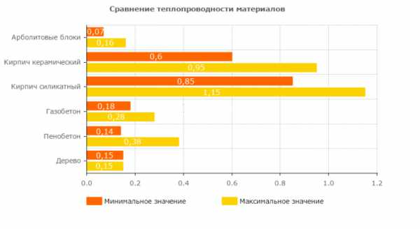 - Теплопроводность. В зависимости от плотности блока, теплопроводность материала варьируется от 0,08 до 0,14 Вт/м°C (чем выше плотность – тем выше теплопроводность). Эта характеристика значительно превосходит теплопроводность керамического кирпича (0,06-0,09 Вт/м°C). Поэтому дом, утепленный арбоблоками, будет теплым. Для зон с умеренным климатом вполне хватит толщины кладки в 30-35 см.