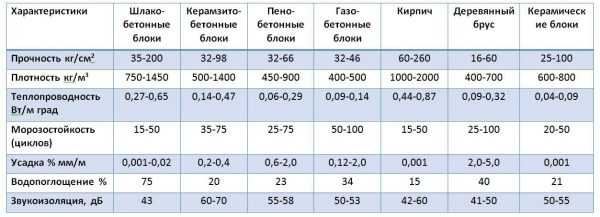 Оценить свойства шлакоблока можно только в сравнении с другими строительными материалами. Для удобства они сведены в таблицу. Как видите, по каким-то показателям он вполне на высоте, по каким-то во многом проигрывает. Обратите внимание, что керамзитобетон тут выделен в отдельную графу, так как его часто рассматривают как отдельный материал.