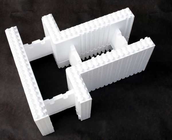 Типичный полистирольный блок состоит из соединенных между собой жесткими перемычками двух панелей пенополистирола. При укладке на стены каждый блок закрепляется нижним, верхним и торцевым граням панелей. Такая последовательность при укладке блоков создает высокий коэффициент сцепления и плотную, а значит и очень прочную укладку блоков. Образованная в процесс кладки полость проходит процесс армирования и заполняется бетоном. В конечном итоге получается монолитное здание из железобетона.