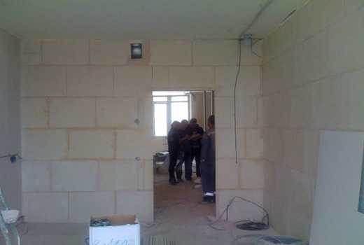 - Умеренно прочные. Различные модификации переносят нагрузки в пределах 35 — 50 кг/см?. В ходе опытного тестирования гипсолитная перегородка продемонстрировала способность выдерживать 200 кг на две точки фиксации. Это значит, что она вполне подходит для монтажа навесного оборудования и сантехники.