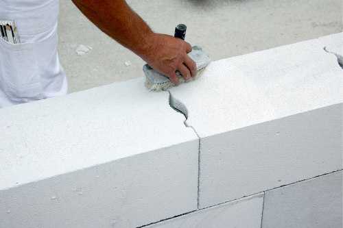 - Упрощенный монтаж гипсовым клеем при экономичном расходе смеси. Максимальная ширина стыков 2 мм. Кладку облегченного камня также выполняют на клеевой основе. Однако при этом образуются соединительные швы до 10 мм, а значит, требуется больше кладочного раствора. Качество кладки существенно улучшается с помощью пеноблоков пазогребневых. В таком виде изделия также выпускаются.