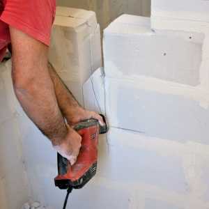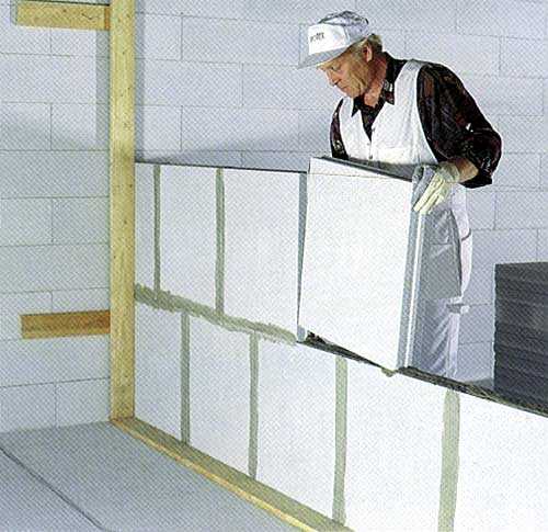 Первый ряд блочной конструкции выкладывается на ровную основу, предварительно очищенную от пыли и прогрунтованную одновременно со стеной. От качества начальной кладки зависит вся дальнейшая работа и ее результаты. Вспомогательных крепежей не требуется. Верхнюю границу примыкания лучше всего заизолировать монтажной пеной. Это обеспечит дополнительную звукоизоляцию помещения и убережет от усадочных процессов.