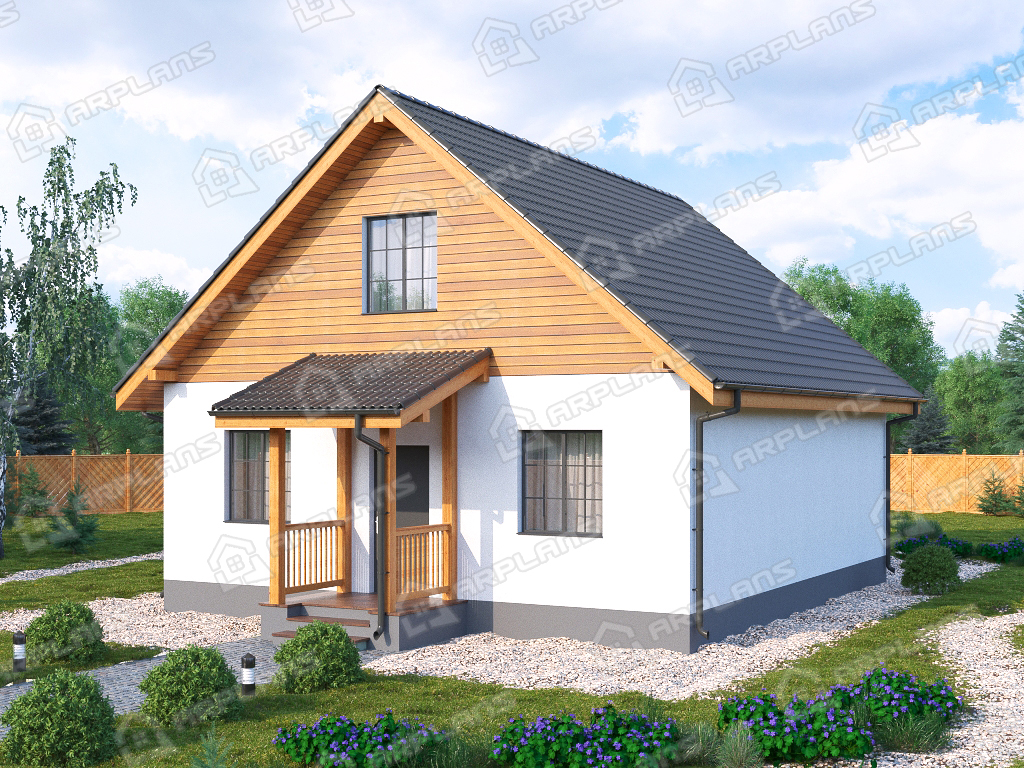 Дом с мансардой прекрасно вписывается в ландшафтный дизайн участка. В этом доме могла бы жить семья с детьми. Наличие перед входом в дом просторной террасы, позволит детям играть на ней в любое время года.