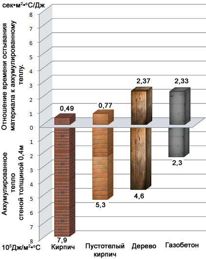 В гистограмме представлены характеристики аккумуляции тепла и остывания стен из различных строительных материалов одинаковой толщины. При сравнении показателей по аккумуляции тепла в образцах и их остыванию у газобетона D500 наблюдается высокий уровень тепловой инерции и сопоставимая с деревом хорошая теплоизоляция.