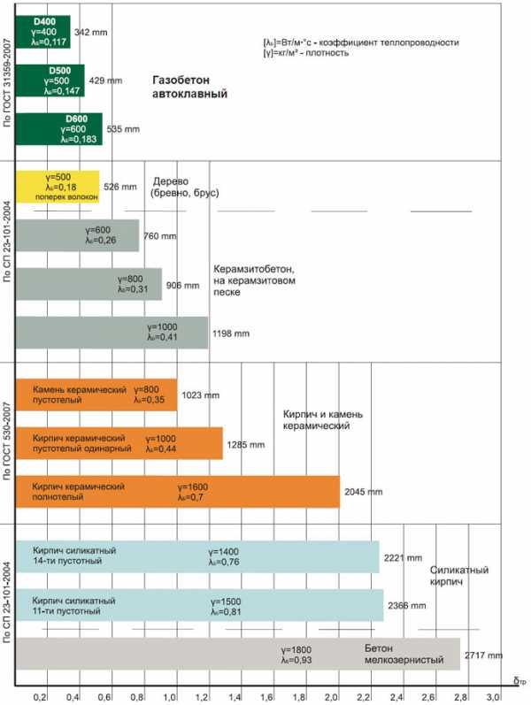 Далее предоставлена таблица, отображающая требуемую государственными нормами по тепловой защите толщину однородных стен из наиболее распространенных конструкционно-теплоизоляционных и конструкционных строительных материалов.