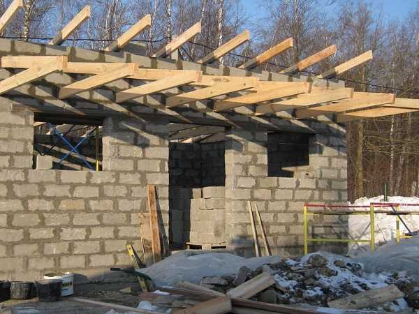 - Перед сборкой крыши наружная сторона здания доводится до нужной высоты, обеспечивая расчетный уклон.