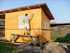 - Обшиваем конструкцию при помощи обрезных досок, после чего вставляем двери и окна.