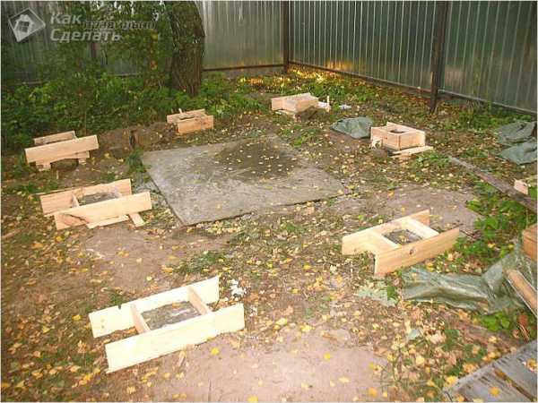 - Для этого нужно, с противоположных сторон нашей постройки закрепить доски, с одной стороны более широкие в диаметре, в этом случае Вы получите желаемый наклон;