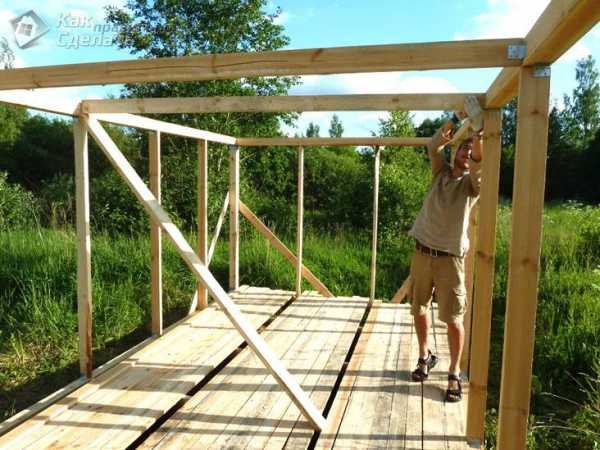 - Для установки крыши на верхушки стен вмонтируйте деревянные лаги;