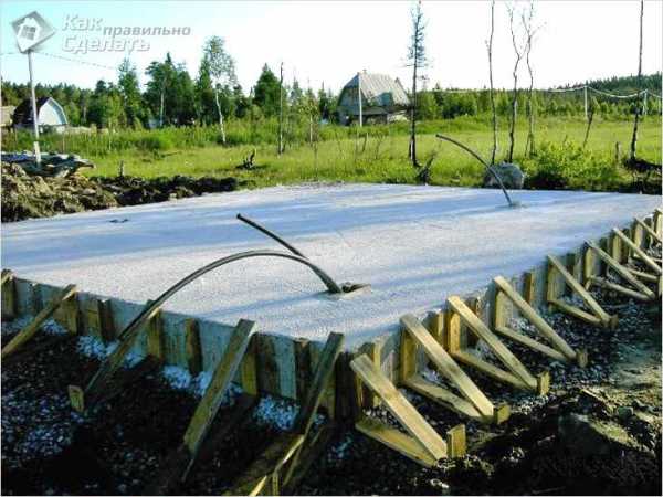- После этого приступаем к заливке ленточного фундамента (готовому фундаменту необходимо полностью застыть на протяжении нескольких дней, если заливка осуществляется в жаркую погоду, тогда обязательно поливаем свежий фундамент водой, что бы не произошло рассыхание и растрескивание раствора).