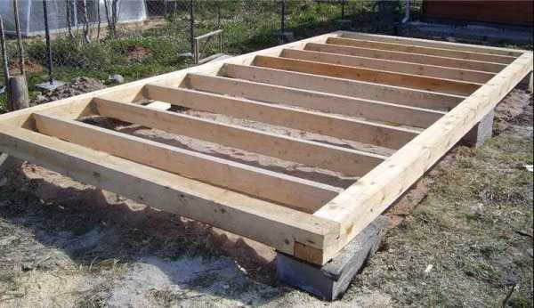 - Возводим каркас сарая из деревянных брусков. Сразу же рекомендуется сделать нижнюю обвязку и лаги для пола.