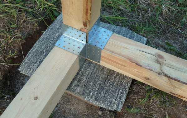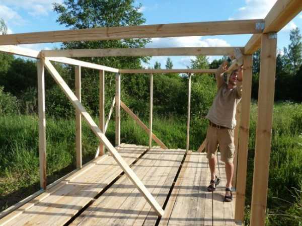 - По углам планируемой постройки вкапываем 4 трехметровых столба на 60 см в почву. Нижнюю часть будущих опор необходимо заизолировать от преждевременного гниения (в интернете масса вариантов изоляции, например, при помощи толя). Задние столбы обязательно делаем на 15-20 см ниже, что бы осуществить скат воды.