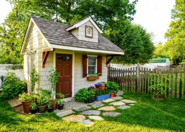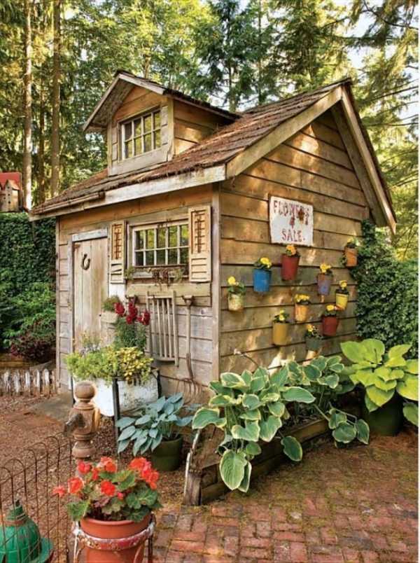 - Украшаем построенный своими руками сарай для дачи при помощи вазонов с цветами, подделок и т.д.
