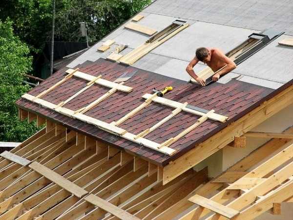 - Переходим к кровле крыши. Для этого крепим 3 бруска на верхнюю обвязку (они буду в качестве стропил). Расстояние между брусками должно быть одинаковое. Далее стропила зашиваем досками и стелим на них рубероид (напуская по 5 см между стыками). Листы рубероида обязательно закрепляем при помощи брусков, которые прибиваются вдоль крыши. Не забываем соорудить сток дождевой воды.