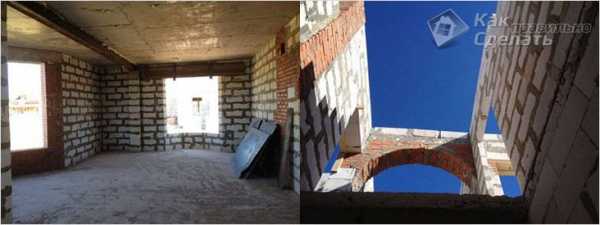 - одновременно с кладкой внешних стен нужно возвести внутренние несущие ограждения; внутренняя стена перевязывается с внешней кладкой через ряд; во внешней стене вырезается часть ограждения по поперечному размеру блока внутренней кладки.