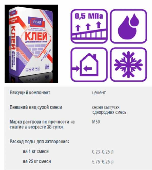 На рисунке ниже приведены основные характеристики клея для газобетона.