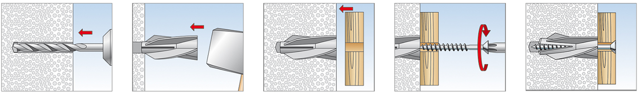 Данный крепеж разрабатывался специально для пористых материалов. Хорошие показатели сопротивления нагрузкам достигаются за счет фигурных металлических ребер, которые расклиниваются в процессе вкручивания шурупа или самореза.