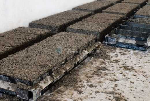 Лишняя масса ударяется при помощи линейки, а форма выдерживается сутки с температурой воздуха от +18оС. По истечению времени блоки извлекаются из форм путем небольшого постукивания и выкладываются на ровное основание для полного затвердения на 2 дня и просушивания на срок от 10 дней.