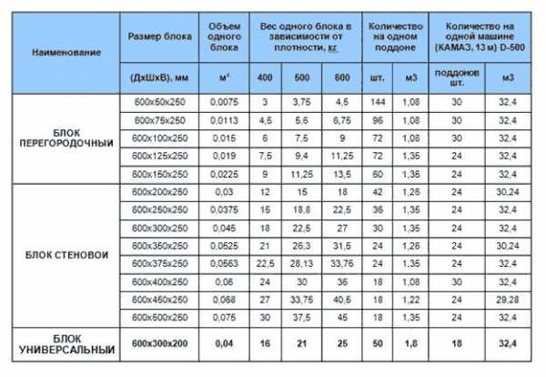 Единственный доступный способ контроля — взвешивание. Данные по размерам, объему и массе перегородочных блоков из газобетона приведены в таблице.