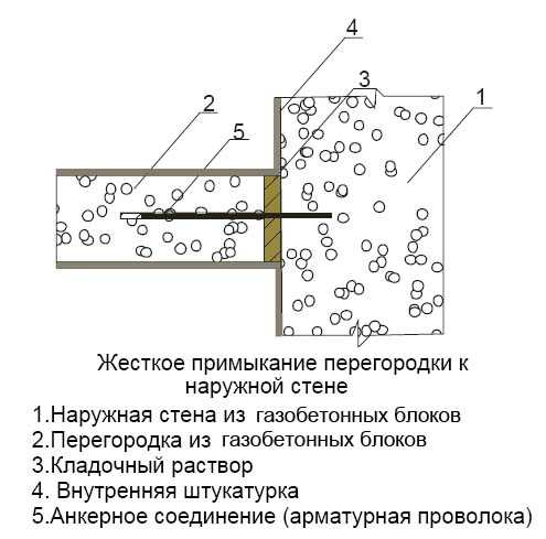При жестком соединении перегородки и наружные стены соединяются перевязкой элементов кладки либо с помощью полосовых соединителей или анкеров. При использовании соединителей, в процессе выполнении кладки соединители или анкера на половину их длинны, запускают в несущую стену.Перегородочные блоки устанавливаются таким образом, чтобы швы несущей стены и перегородки совпали, а выступающие из шва стены соединители либо вмурованные анкера, должны совпадать со швами перегородки. Жесткое примыкание не рекомендуется использовать, а если и применять, то только в случаях, когда конструкция здания имеет очень жесткий каркас, по причине большой вероятности появления трещин.