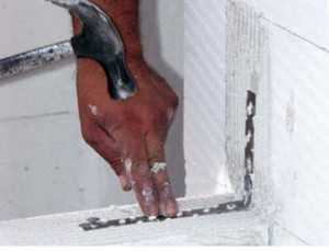 - С помощью инструмента каждый элемент простукивается и проверяется строительным уровнем. Таким образом, газобетонные блоки укладывают до достижения проема двери и отступают 0,5 см.