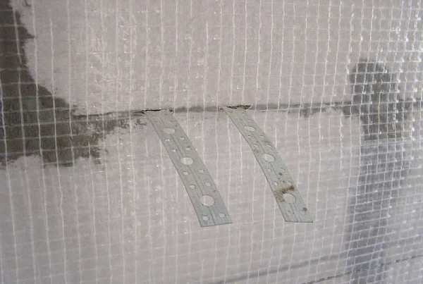 На коротких пролетах — до 3-х метров — армирование не делают совсем. На более длинных укладывают армирующую полимерную сетку, перфорированную металлическую полосу, как на фото, и т.п.