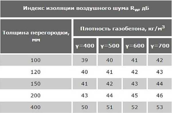 Чтобы иметь представление, насколько «шумны» газосиликатные блоки, приведем таблицу с нормативными показателями звукового сопротивления блоков разной плотности и разной толщины.