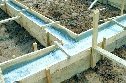 Опалубка заливается бетоном, сверху желательно уложить кладочную сетку, а после снова залить бетоном. Следующий шаг — гидроизоляция фундамента двухслойным рубероидом. Внутри фундамента прокладывается канализация и приемник.