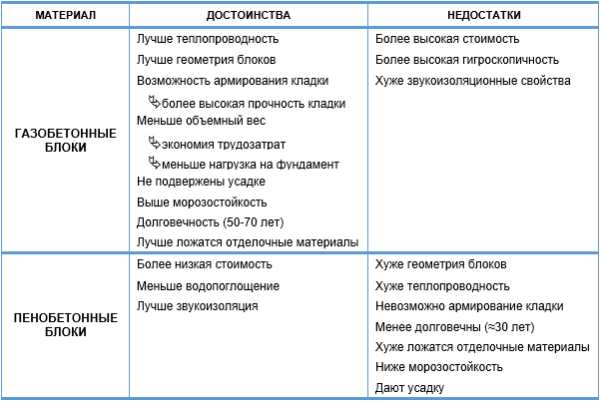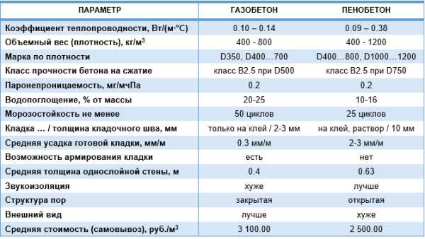 Таблица сравнительных характеристик газобетона и пенобетона