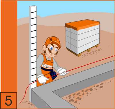 5. В углах здания рекомендуется выставлять рейки с рисками, соответствующими высоте ряда кладки, и натянуть шнур-причалку для кладки очередного ряда.