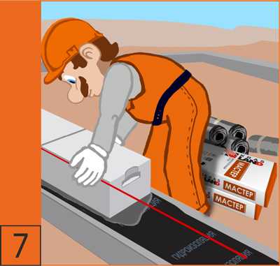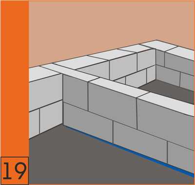 7. От выполнения кладки первого ряда блоков зависит качество всего дома. Между фундаментом и кладкой необходимо выполнить гидроизоляцию по верхней отметке фундамента. Первый ряд блоков следует укладывать на выравнивающий слой цементно-песчаного раствора Krasland МАСТЕР.