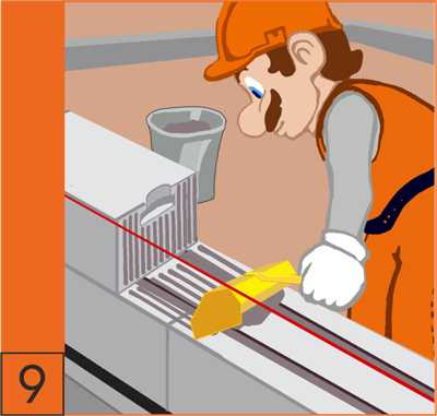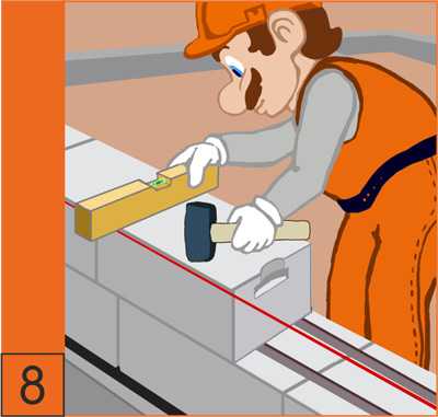 8. Установка каждого блока контролируется по уровню и шнуру-причалке. Для точного позиционирования блоков в кладке используется резиновая киянка (см. инструменты)