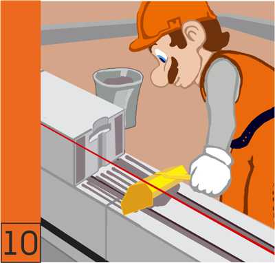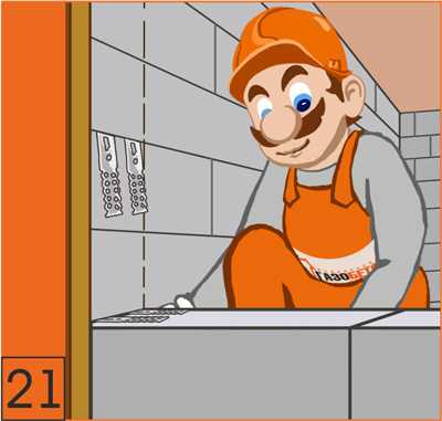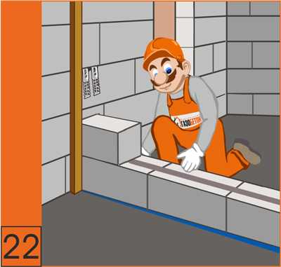 16. Первый и каждый третий ряд кладки необходимо армировать (для сейсмичных районов каждый второй ряд). В штробу, предварительно подготовленную ручным штроборезом (см. инструменты) и обеспыленую с помощью щетки-смётки (см. инструменты), заполнить клеевым раствором и уложить арматуру. Излишки клея удаляются.