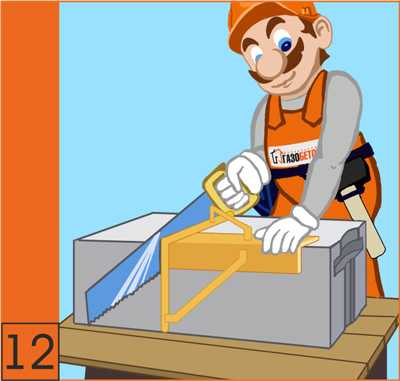 12. Доборные блоки легко выпиливаются при помощи ножовки (см. инструменты). Для обеспечения точности резки блоков и соблюдения прямых углов применяется угольник (см. инструменты)