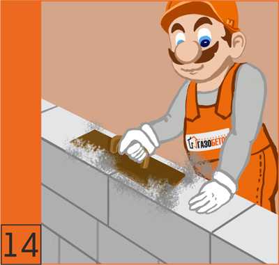 15. К кладке следующего можно приступать после схватывания раствора предыдущего ряда (т.е. через 1-2 часа). Кладка начинается с угла перевязкой блоков, смещение рядов должно быть не менее 10-20 см.
