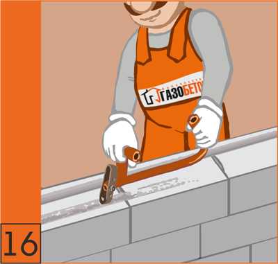 14. После укладки очередного ряда блоков поверхность выравнивается с помощью рубанка для газобетона (см. инструменты). Перепады между соседними блоками не допускается.