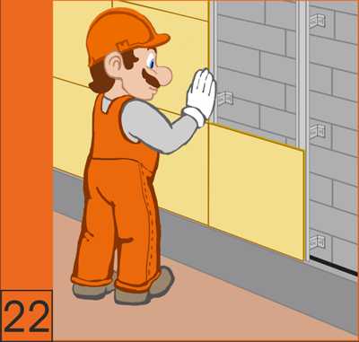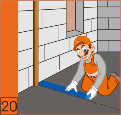 20. В случае, если перегородки выполняются после монтажа несущих стен, необходимо укладывать мелкопористую битумную полимерную ленту. Для улучшения звукоизоляции в месте примыкания к боковой стене также уложить уплотняющую ленту из мелкопористого материала.
