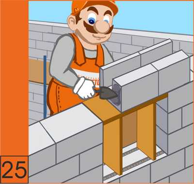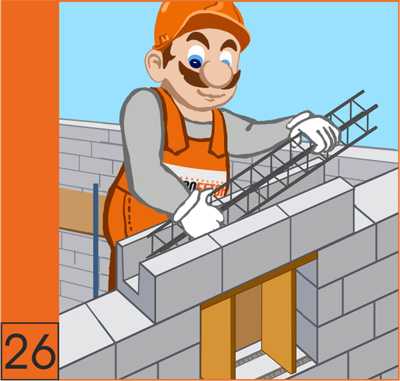 24. Для перекрытия оконyых и дверных проемов из U-образных блоков формируются перемычки нужной длинны с учетом ширины проема. Для этого над оконными и дверными проемами устанавливается опалубка из деревянного бруса или металлических профилей.