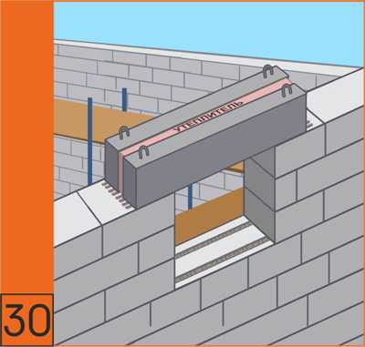 30. Для перекрытия оконных и дверных проемов могут применятся типовые железобетонные перемычки. Перемычки монтировать на слой цементно-песчаного раствора толщиной 10-20 мм. При использовании монолитных железобетонных перемычек необходимо предусматривать их дополнительное утепление.