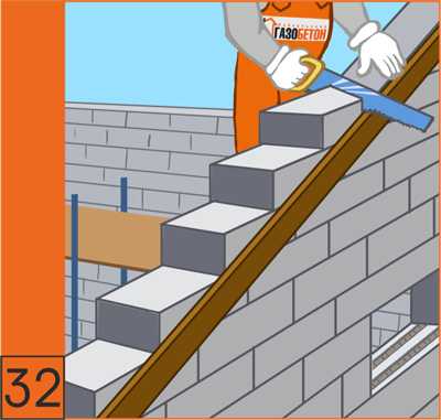 32. Для формирования необходимого наклона кладки использовать ножовку и рубанок для газобетона (см. инструменты). Поверх стены устраивается антисейсмический (армированный) пояс с применением U-образных блоков.