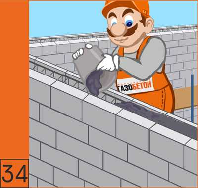 34. Верхний ряд блоков под перекрытием выкладывается из U-образных блоков. По всему периметру в U-образных блоках монтируется арматурный каркас. Затем выемка U-образных блоков заливается тяжелым бетоном (по принципу монтажа перемычек)