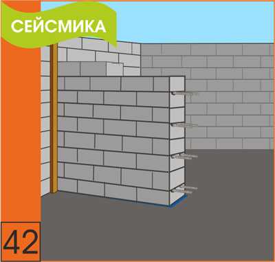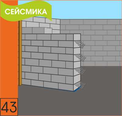 42. Необходимо армировать первый и каждый второй последующий ряды кладки газобетонных блоков. Для стен толщиной 400 мм необходимо применять не менее двух стержней d=8 мм.