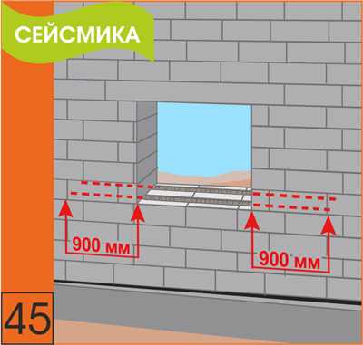 45. Следует армировать зоны под оконными проемами. Арматура должна быть заведена на 900 мм в каждую сторону от края проема.