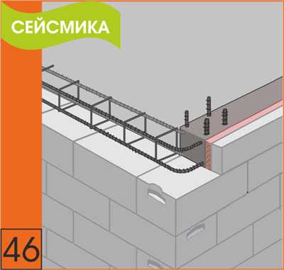 46. В уровне перекрытия необходимо устраивать антисейсмический пояс с армированием не менее 4d 10 мм по всем несущим стенам. Антисейсмический пояс и вертикальный железобетонные включения связать между собой. В зданиях с монолитными железобетонными перекрытиями антисейсмические пояса в уровне этих перекрытий не устраивают.