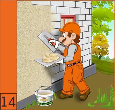 13. Наружная отделка текстурным покрытием Krasland RUGOSO. Обработать поверхность укрепляющей пропиткой для внутренних и наружных работ Krasland G02 и дать просохнуть.