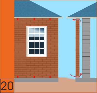 20. Гибкие связи обеспечивают создание вентиляционного зазора в 30-50 мм между несущей стеной из газобетона и облицовкой из кирпича. В кирпичной кладке необходимо устраивать продухи понизу и поверху, для циркуляции воздуха, 75 на 20 м² кладки.