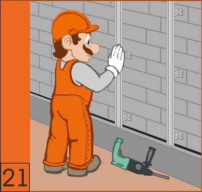 21. Каждый второй ряд перегородки и наружной стены связать оцинкованной перфополосой, ранее установленной в несущей стене. Внутренние и наружные несущие стены перевязывать кладкой или с применением Т-образных анкеров.