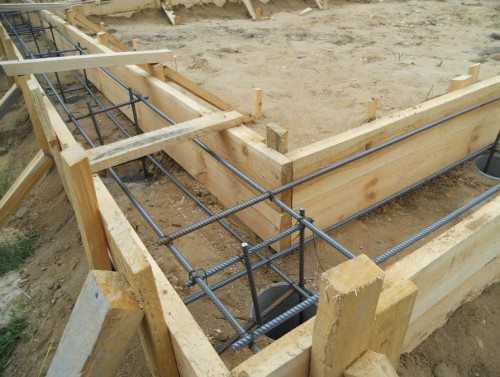 - Поверх подушки, в засыпанную траншею монтируют опалубку 40х60 сантиметров (над нулевым уровнем возвышается 40-сантиметровая часть большей грани) или фундаментный блок таких же размеров. В опалубке обустраивают две параллельных, горизонтальных перевязки, разделенных вертикальными стойками.