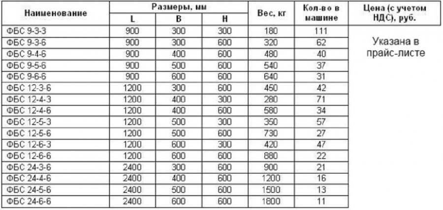 Таблица размеров и других характеристик фундаментных блоков ФБС